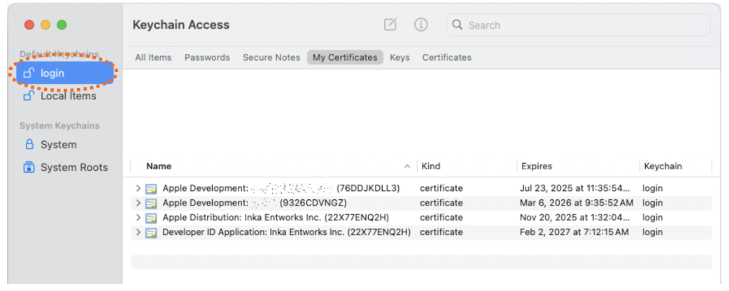 In the Mac’s launchpad, go to Other Items and you will find the “Keychain Access” app. Run this app and when you see the screen below, select the “login” item from the left tab.