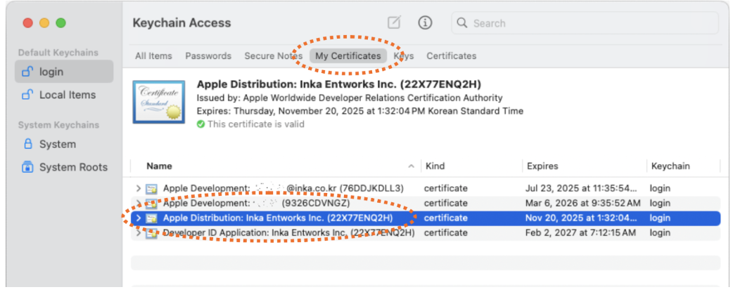 Select “My Certificates” from the top tab menu in the right pane and select the distribution certificate registered in your keychain.