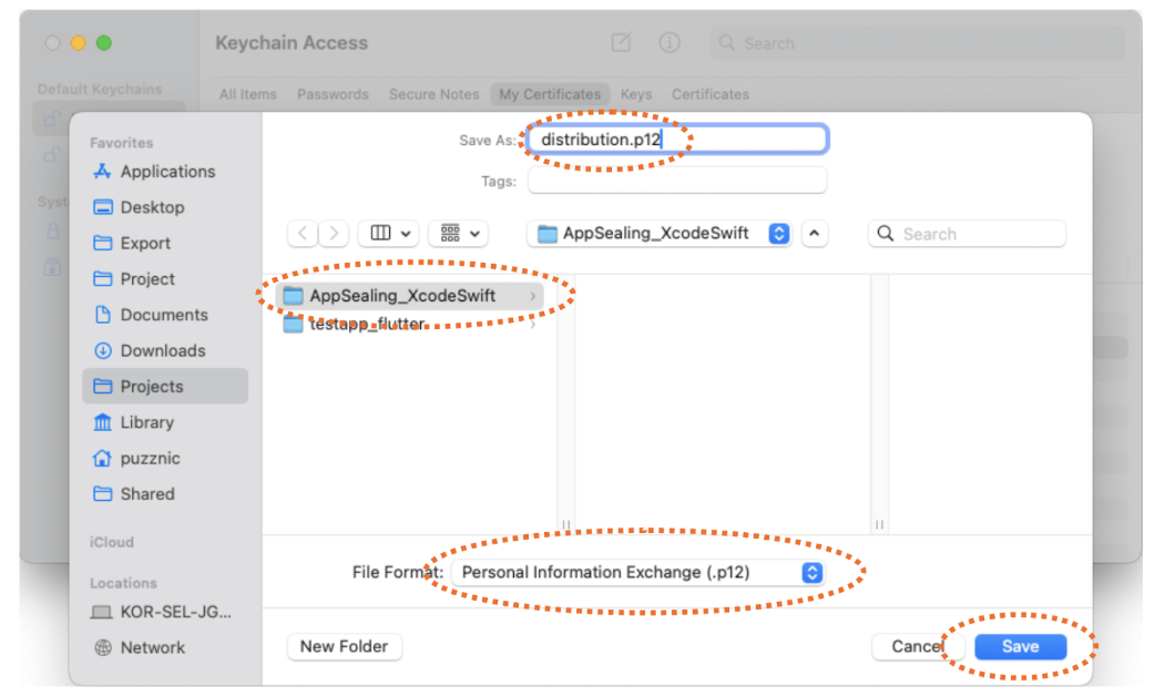 Select the save location as the project folder, the file name as “distribution.p12”, and the file format as “Personal Information Exchange (.p12)”