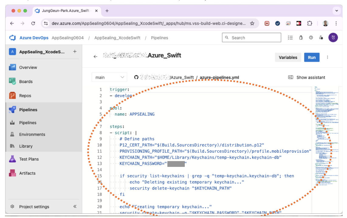 Before adding the certificate and profile to the project and pushing it to the source code repository, perform the following steps first. After completing all the steps up to the final step, you must push it to the repository so that the Azure pipeline builds normally.