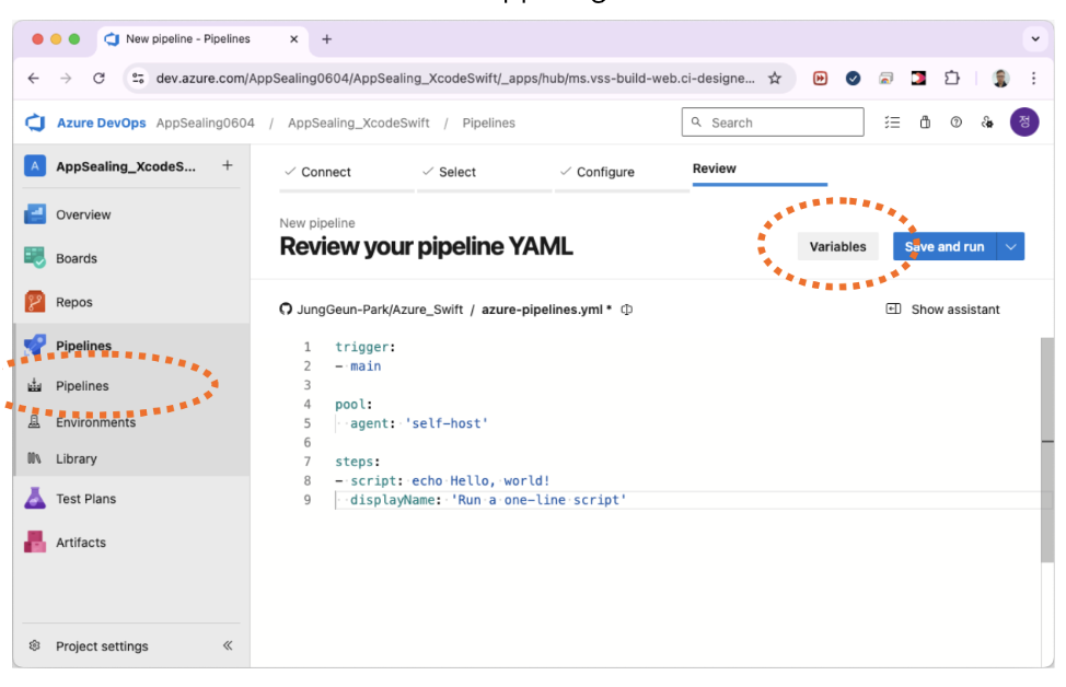 Go to the project screen on the Azure DevOps page, select the currently active Pipelines, and click the “Variables” button in the upper right corner.