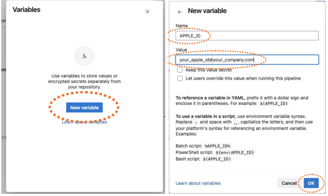 Click on “New Variables” to add the “Name” and “Value”. Add “APPLE_ID” in the “Name” field and enter the ID value of the Apple account you are actually using in the “Value” field. Then click the “OK” button.