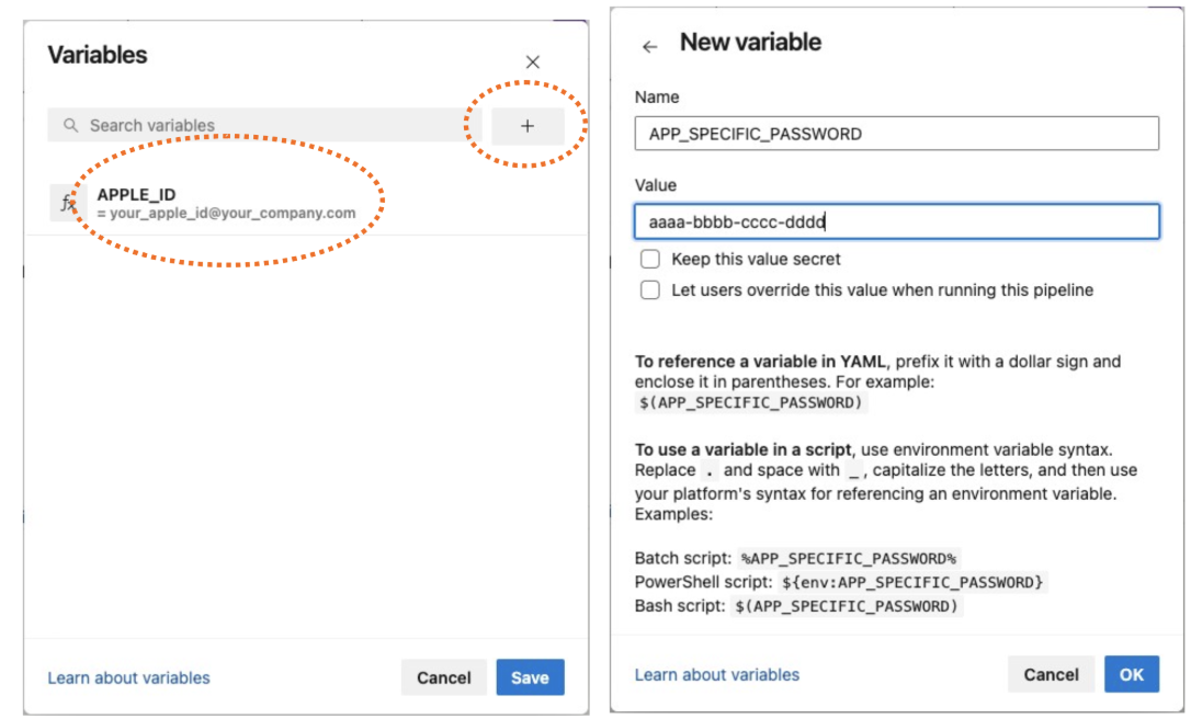 You can see that the “APPLE_ID” variable has been registered. Now, click the “+” button again to add a new variable. Enter the string “APP_SPECIFIC_PASSWORD” in the “Name” field and enter the actual app-specific password value you are using in the “Value” field.