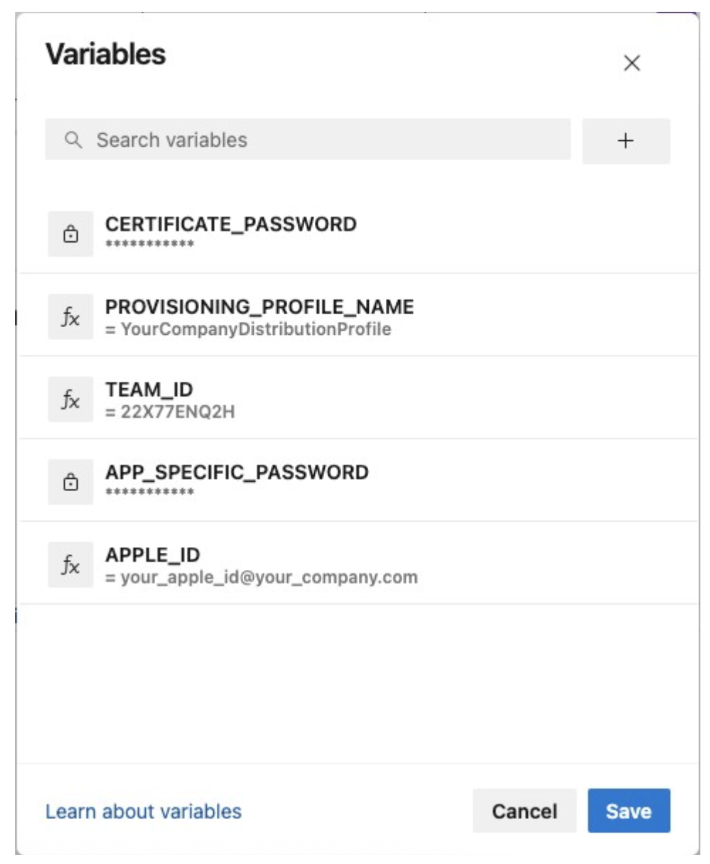In the same way, add three more variables: TEAM_ID, PROVISIONING_PROFILE_NAME, CERTIFICATE_PASSWORD. PROVISIONING_PROFILE_NAME value specifies the name of the provisioning profile used to deploy the app. Once all variables are entered, you should finally see a screen similar to the below one.