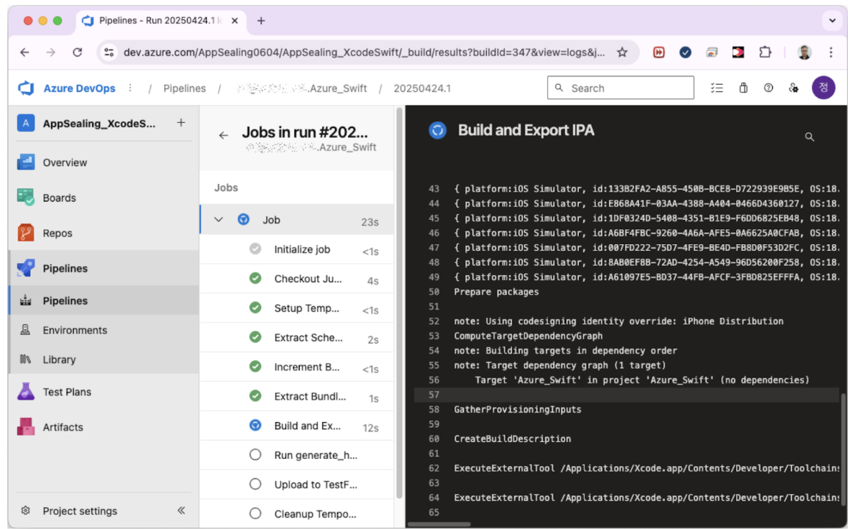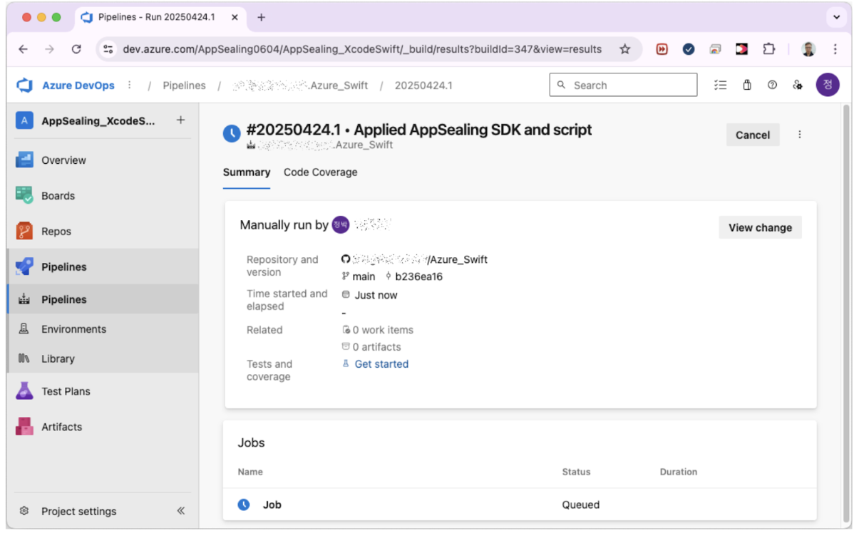 After modifying the YML script and pushing the code, the build will proceed as shown in the screen below with the AppSealing SDK applied.